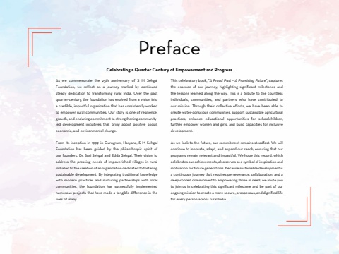PrefaceAs we commemorate the 25th anniversary of S M Sehgal Foundation, we reflect on a journey marked by continued steady dedication to transforming rural India. Over the past quarter-century, the foundation has evolved from a vision into a credible, impactful organization that has consistently worked to empower rural communities. Our story is one of resilience, growth, and enduring commitment to strengthening communityled development initiatives that bring about positive social, economic, and environmental change.From its inception in 1999 in Gurugram, Haryana, S M Sehgal Foundation has been guided by the philanthropic spirit of our founders, Dr. Suri Sehgal and Edda Sehgal. Their vision to address the pressing needs of impoverished villages in rural India led to the creation of an organization dedicated to fostering sustainable development. By integrating traditional knowledge with modern practices and nurturing partnerships with local communities, the foundation has successfully implemented numerous projects that have made a tangible difference in the lives of many.This celebratory book, \the essence of our journey, highlighting significant milestones and the lessons learned along the way. This is a tribute to the countless individuals, communities, and partners who have contributed to our mission. Through their collective efforts, we have been able to create water-conscious communities, support sustainable agricultural practices, enhance educational opportunities for schoolchildren, further empower women and girls, and build capacities for inclusive development.As we look to the future, our commitment remains steadfast. We will continue to innovate, adapt, and expand our reach, ensuring that our programs remain relevant and impactful. We hope this record, which celebrates our achievements, also serves as a symbol of inspiration and motivation for future generations. Because sustainable development is a continuous journey that requires perseverance, collaboration, and a deep-rooted commitment to empowering those in need, we invite you to join us in celebrating this significant milestone and be part of our ongoing mission to create a more secure, prosperous, and dignified life for every person across rural India.Celebrating a Quarter Century of Empowerment and Progress