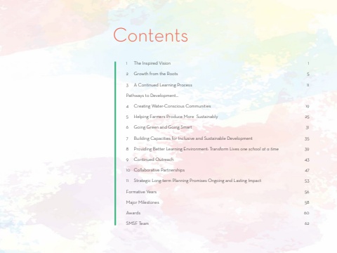 Contents1 The Inspired Vision 12 Growth from the Roots 53 A Continued Learning Process 11Pathways to Development...4 Creating Water-Conscious Communities 195 Helping Farmers Produce More Sustainably 256 Going Green and Going Smart 317 Building Capacities for Inclusive and Sustainable Development 358 Providing Better Learning Environment: Transform Lives one school at a time 399 Continued Outreach 4310 Collaborative Partnerships 4711 Strategic Long-term Planning Promises Ongoing and Lasting Impact 53Formative Years 56Major Milestones 58Awards 60SMSF Team 62