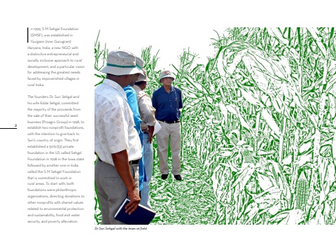In 1999, S M Sehgal Foundation (SMSF), was established in Gurgaon (now Gurugram) Haryana, India, a new NGO with a distinctive entrepreneurial and socially inclusive approach to rural development, and a particular vision for addressing the greatest needs faced by impoverished villages in rural India.The founders Dr. Suri Sehgal and his wife Edda Sehgal, committed the majority of the proceeds from the sale of their successful seed business (Proagro Group) in 1998, to establish two nonprofit foundations, with the intention to give back to Suri%u2019s country of origin. They first established a 501(c)(3) private foundation in the US called Sehgal Foundation in 1998 in the Iowa state followed by another one in India called the S M Sehgal Foundation that is committed to work in rural areas. To start with, both foundations were philanthropic organizations, directing donations to other nonprofits with shared values related to environmental protection and sustainability, food and water security, and poverty alleviation.Dr Suri Sehgal with the team at field2