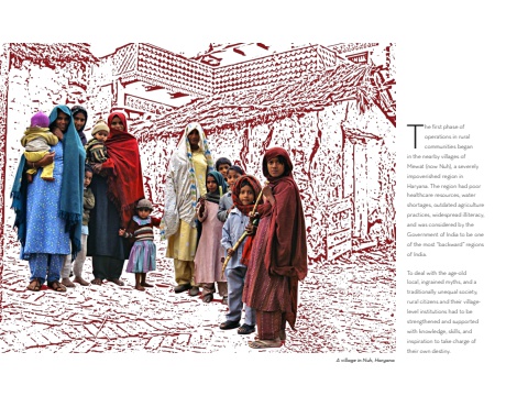 The first phase of operations in rural communities began in the nearby villages of Mewat (now Nuh), a severely impoverished region in Haryana. The region had poor healthcare resources, water shortages, outdated agriculture practices, widespread illiteracy, and was considered by the Government of India to be one of the most %u201cbackward%u201d regions of India.To deal with the age-old local, ingrained myths, and a traditionally unequal society, rural citizens and their villagelevel institutions had to be strengthened and supported with knowledge, skills, and inspiration to take charge of their own destiny. A village in Nuh, Haryana