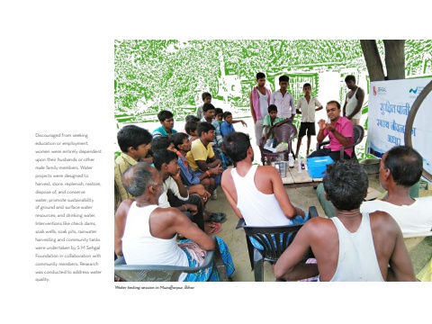 Discouraged from seeking education or employment, women were entirely dependent upon their husbands or other male family members. Water projects were designed to harvest, store, replenish, restore, dispose of, and conserve water; promote sustainability of ground and surface water resources; and drinking water. Interventions like check dams, soak wells, soak pits, rainwater harvesting and community tanks were undertaken by S M Sehgal Foundation in collaboration with community members. Research was conducted to address water quality. Water testing session in Muzaffarpur, Bihar