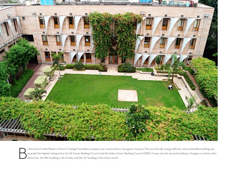 By the end of 2008, Phase I of the S M Sehgal Foundation campus was constructed in Gurugram, Haryana. This eco-friendly, energy-efficient, and sustainable building was awarded the highest rating set by the US Green Building Council and the Indian Green Building Council (IGBC). It was only the second building in Gurgaon to achieve this distinction, the fifth building in all of India, and the 75th building in the entire world.