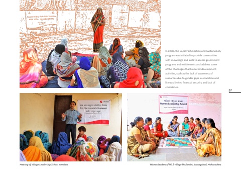 In 2008, the Local Participation and Sustainability program was initiated to provide communities with knowledge and skills to access government programs and entitlements and address some of the challenges that hindered development activities, such as the lack of awareness of resources due to gender gaps in education and literacy, limited financial security, and lack of confidence. Meeting of Village Leadership School members Women leaders of WLS village Phulambri, Aurangabad, Maharashtra37