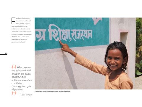 Feedback from donors and partners in the US leant greater support and manageability to an initiative introduced in 2016, Transform Lives one school at a time, a program to empower children, and a conducive learning environment in government schools.A happy girl at the Government School in Alwar, Rajasthan When women are educated and children are given opportunities, entire communities can thrive, breaking the cycle of poverty.%u2014 Edda Sehgal40