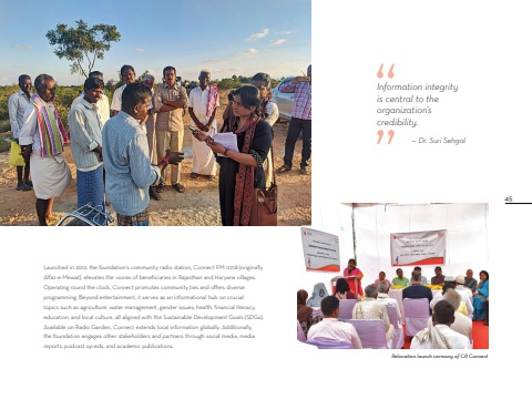 Launched in 2012, the foundation's community radio station, Connect FM 107.8 (originally Alfaz-e-Mewat), elevates the voices of beneficiaries in Rajasthan and Haryana villages. Operating round the clock, Connect promotes community ties and offers diverse programming. Beyond entertainment, it serves as an informational hub on crucial topics such as agriculture, water management, gender issues, health, financial literacy, education, and local culture, all aligned with the Sustainable Development Goals (SDGs). Available on Radio Garden, Connect extends local information globally. Additionally, the foundation engages other stakeholders and partners through social media, media reports, podcast op-eds, and academic publications.Relocation launch cermony of CR ConnectInformation integrity is central to the organization%u2019s credibility.%u2014 Dr. Suri Sehgal45