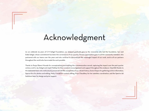 AcknowledgmentAs we celebrate 25 years of S M Sehgal Foundation, our deepest gratitude goes to the visionaries who laid the foundation, Suri and Edda Sehgal, whose commitment has been the cornerstone of our journey. Sincere appreciation goes to all the community members who partnered with our teams over the years and who continue to demonstrate the meaningful impact of our work, and to all our partners throughout the world who have made the work possible. Thanks to Pooja Oberoi Murada for conceptualizing and drafting this commemorative record, capturing the impact over the past quarter century and to Jay Sehgal and Anjali Makhija for their constant encouragement and support throughout this endeavor. Heartfelt thanks to the dedicated team who meticulously preserved old files and photos of our vibrant history, Sonia Chopra for gathering archive information, Siprian Kiro for photos and editing, Marly Cornell for content editing, Priya Chaudhary for her seamless coordination, and the Spectra Ad Solutions team for design and print support.