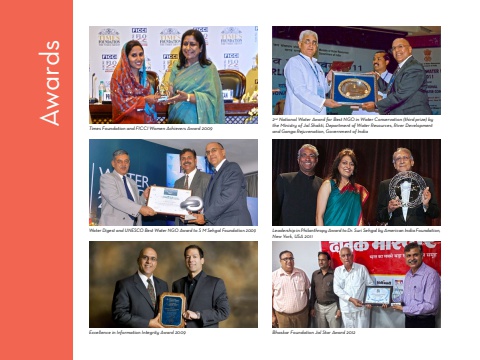 AwardsTimes Foundation and FICCI Women Achievers Award 2009Water Digest and UNESCO Best Water NGO Award to S M Sehgal Foundation 2009 Leadership in Philanthropy Award to Dr. Suri Sehgal by American India Foundation, New York, USA 2011Excellence in Information Integrity Award 2009 Bhaskar Foundation Jal Star Award 20122nd National Water Award for Best NGO in Water Conservation (third prize) by the Ministry of Jal Shakti, Department of Water Resources, River Development and Ganga Rejuvenation, Government of India