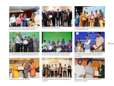 S M Sehgal Foundation Team receiving the first prize - FICCI Water Award Aug 6, 2013 - Water Initiatives by NGOsIOWA Agriculture Leader Award 2017 S M Sehgal Foundation awarded with Bhamashah Award for school transformation 2023S M Sehgal Foundation awarded Leadership in Energy and Environmental Design by Indian Green Building Council 2013CR Connect FM 107.8 won the National Community Radio Award 2019 by Ministry of Information and BroadcastingCR Connect FM 107.8 received the National Award for its sustainability model 2023 by Ministry of Information and BroadcastingManthan Award to community radio, 2015 S M Sehgal Foundation wins FICCI Sustainable Agriculture Award 2021Bharat Samman Life Time Achievement Award by NRI Institute to Dr. Suri Sehgal61