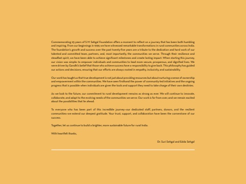 Commemorating 25 years of S M Sehgal Foundation offers a moment to reflect on a journey that has been both humbling and inspiring. From our beginnings in 1999, we have witnessed remarkable transformations in rural communities across India. The foundation's growth and success over the past twenty-five years are a tribute to the dedication and hard work of our talented and committed team, partners, and, most importantly, the communities we serve. Through their resilience and steadfast spirit, we have been able to achieve significant milestones and create lasting impact. When starting this journey, our vision was simple: to empower individuals and communities to lead more secure, prosperous, and dignified lives. We were driven by Gandhi%u2019s belief that those who achieve success have a responsibility to give back. This philosophy has guided our actions and decisions, ensuring that our efforts are always rooted in empathy, inclusivity, and sustainability. Our work has taught us that true development is not just about providing resources but about nurturing a sense of ownership and empowerment within the communities. We have seen firsthand the power of community-led initiatives and the ongoing progress that is possible when individuals are given the tools and support they need to take charge of their own destinies.As we look to the future, our commitment to rural development remains as strong as ever. We will continue to innovate, collaborate, and adapt to the evolving needs of the communities we serve. Our work is far from over, and we remain excited about the possibilities that lie ahead.To everyone who has been part of this incredible journey%u2014our dedicated staff, partners, donors, and the resilient communities%u2014we extend our deepest gratitude. Your trust, support, and collaboration have been the cornerstone of our success.Together, let us continue to build a brighter, more sustainable future for rural India.With heartfelt thanks,Dr. Suri Sehgal and Edda Sehgal